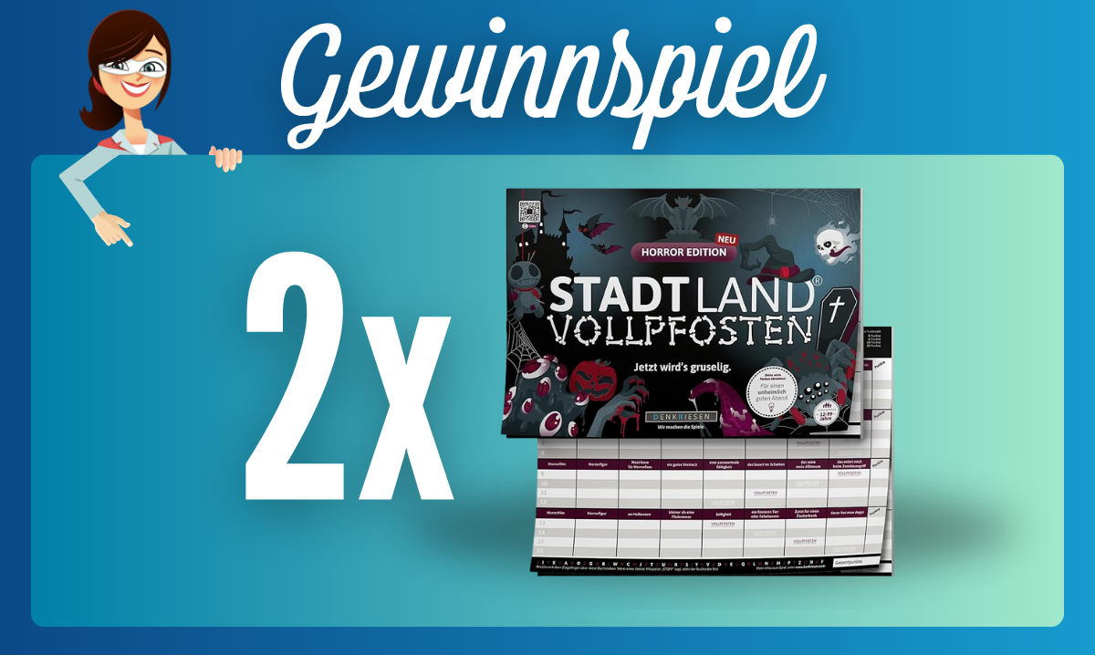 Wir verlosen zweimal das Spiel Stadt Land VOLLPFOSTEN® in der Horror Edition „Jetzt wird’s gruselig.“ Spielerischer Spaß gemeinsam mit Freund:innen oder Familie ist damit vorprogrammiert! Aber keine Sorge – richtig ungeheuer unheimlich wird es nicht, denn das Spiel ist ab 12 Jahren!