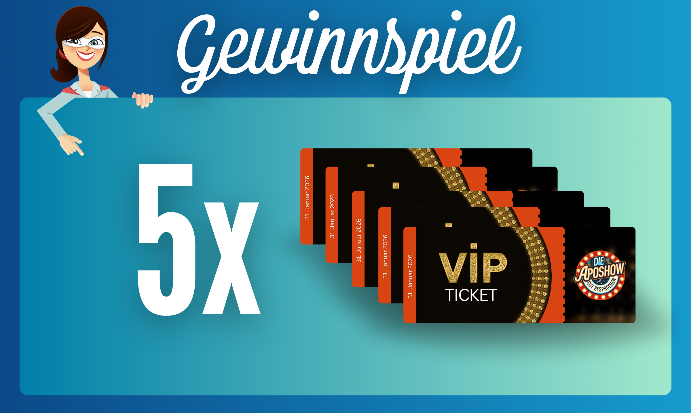 Wir verlosen fünf VIP-Tickets! Mit deinem Gewinn sicherst du dir nicht nur den Zugang zur Live-Aufzeichnung der ApoShow, sondern auch exklusive VIP-Extras, über die wir noch nicht zu viel verraten dürfen.