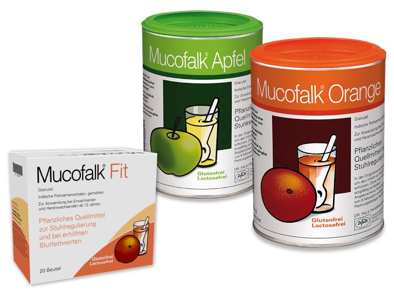 Mucofalk® Apfel/Orange/Fit. Wirkstoff: Indische Flohsamenschalen (Plantago ovata Samenschalen, gemahlen). Zusammensetzung: 5 g Granulat (1 Beutel bzw. 1 gestr. ML) enthalten: Arzn. wirks. Bestandteil: 3,25 g Indische Flohsamenschalen, gemahlen. Sonst. Bestandteile: Sucrose (Saccharose), Citronensäure, Dextrin (aus Mais oder Kartoffeln), Natriumalginat, Natriumcitrat (Ph.Eur.), Apfel- bzw. Orangen-Aroma, Natriumchlorid, Saccharin-Natrium. Anwendungsgebiete: Chronische Obstipation. Erkrankungen, bei denen eine erleichterte Darmentleerung mit weichem Stuhl angestrebt wird, z. B. bei schmerzhafter Stuhlentleerung nach operativen Eingriffen im Enddarmbereich, bei Analfissuren, Hämorrhoiden. Unterstützende Therapie bei Durchfällen unterschiedlicher Ursache. Erkrankungen, bei denen eine Erhöhung der täglichen Ballaststoffaufnahme angestrebt wird, z. B. bei Reizdarmsyndrom, wenn die Obstipation im Vordergrund steht. Zusätzlich Mucofalk® Fit: Unterstützend zu einer Diät bei Hypercholesterinämie. Gegenanzeigen: Überempfindlichkeit gegen Flohsamen oder einen der sonst. Bestandteile, plötzliche Änderung der Stuhlgewohnheit (länger als 2 Wochen), nicht abgeklärte rektale Hämorrhagien, nicht erfolgte Defäkation nach Einnahme eines Abführmittels, Schluckstörungen und andere Hals- und Rachenprobleme, Stenosen des Oesophagus, der Cardia oder im Gastrointestinaltrakt, drohender oder bestehender Darmverschluss (Ileus), Darmlähmung oder Megakolon-Syndrom. Kinder unter 12 Jahren. Warnhinweise: Vorsicht bei Kotstau und Beschwerden wie Bauchschmerzen, Übelkeit und Erbrechen; auf reichlich Flüssigkeitszufuhr achten. Eine Einzeldosis enthält 0,5 g Sucrose und 90 mg Natrium. Nebenwirkungen: Blähungen und Völlegefühl (klingen normalerweise im Verlauf der Behandlung ab). Bei ungenügender Flüssigkeitszufuhr (mind. 150 ml) können Bauchblähungen und Kotstau auftreten; Gefahr eines Ileus oder einer Oesophagusobstruktion. Überempfindlichkeitsreaktionen nach oraler Einnahme oder durch Hautkontakt, wie Rhinitis, Konjunktivitis, Bronchospasmus, und in einigen Fällen ein anaphylaktischer Schock oder auch Hautreaktionen, wie Exanthem und Pruritus, möglich. Wechselwirkungen: siehe Gebrauchsinformation. Dosierungsanleitung: Erwachsene und Heranwachsende ab 12 Jahren: 2–6 x tägl. 1 ML bzw. 2–6 x tägl. den Inhalt eines Beutels nach Einrühren in reichlich Flüssigkeit einnehmen. Packungsgrößen: 20 Btl., 100 Btl., 150 g Dose, 300 g Dose, Mucofalk® Fit nur in Btl. Stand: 10/2018